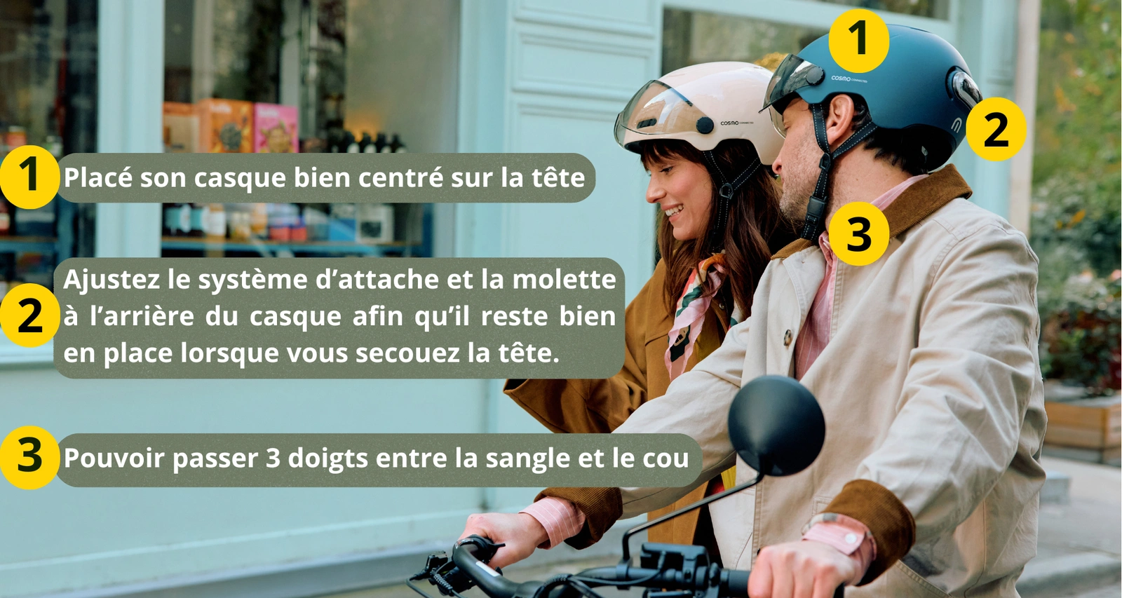 Notre conseil : Lors de l’essayage en magasin ou à la maison, secouez doucement la tête avec le casque posé (sans l’attacher). S’il bouge, c’est que celui-ci est trop grand ou mal ajusté.